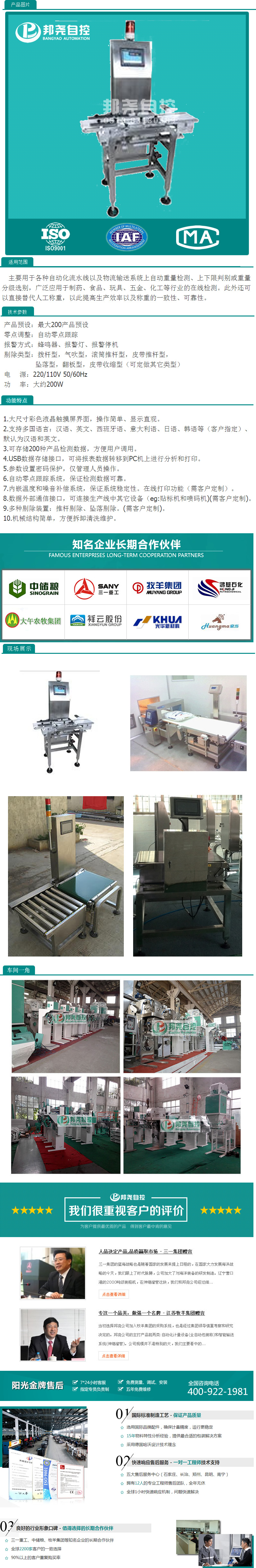 重量選別機又叫重量分選機,在線檢重秤,是一種應用于各種自動化流水線以及物流輸送系統上的自動重量檢測、上下限判別或根據重量檢測產品是否合格的高科技自動化分選設備。廣泛應用于制藥、食品、玩具、五金、化工、汽車配件等行業的在線檢測。此外,還可直接替代人工稱重,以達到提高生產效率,提高準確度和山少人工,降低成本的目的。