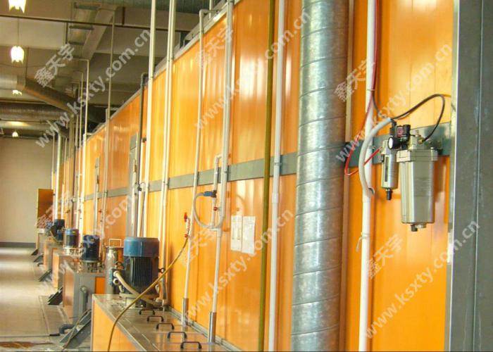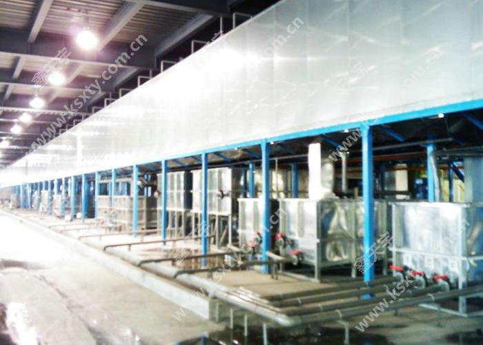 藥水通過噴淋對工件表面進行處理,由于噴射產生一定壓力工件表面能得到較好沖洗效果具有大批量連續(xù)作業(yè)之特點,但一次性投資相對較大藥水用量較大.適用于較長及簡單的表面處理。
